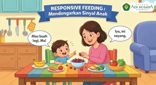 Responsive feeding atau pemberian makan responsif adalah pendekatan memberi makan anak yang menekankan interaksi positif antara pengasuh dan anak selama proses makan.. Strategi pemberian makan ini dapat mendorong anak untuk makan secara mandiri dan merupakan suatu respon terhadap kebutuhan fisiologis dan perkembangan balita yang dapat meningkatkan pengaturan makan sendiri serta dukungan perkembangan kognitif emosional dan sosial balita Responsive feeding merupakan pendekatan dalam pemberian makan pada anak yang direkomendasikan oleh Ikatan Dokter Anak Indonesia (IDAI) dan Kementerian Kesehatan (Kemenkes), anak didorong untuk makan sendiri sesuai dengan kebutuhannya, sementara orang tua atau pengasuh memberikan makanan dengan gizi seimbang, menentukan jadwal makan, serta menciptakan suasana yang mendukung. Kunci dari metode ini adalah komunikasi dua arah: anak menunjukkan keinginannya, dan orang tua atau pengasuh merespons secara tepat, sabar, dan penuh kasih sayang. Prinsip Utama Responsive Feeding Kenali sinyal anak: Anak menunjukkan sinyal lapar dan kenyang dengan berbagai cara, seperti membuka mulut saat disuapi atau menolak makan ketika sudah cukup. Pengasuh perlu belajar memahami sinyal tersebut. Berikan perhatian penuh saat makan: Matikan televisi dan jauhkan distraksi lainnya agar pengasuh bisa fokus dan terlibat aktif dalam proses makan anak. Tanggapi dengan positif: Hindari memaksa anak untuk makan. Sebaliknya, berikan dorongan positif tanpa tekanan agar anak merasa nyaman. Ciptakan rutinitas yang konsisten: Buat jadwal makan yang teratur membantu anak mengenali waktu makan dan membuat tubuhnya lebih siap menerima makanan. Jadwal makan 3 kali sehari untuk makanan utama dan 1-2 kali selingan dengan pemberian ASI bagi baduta dan pemberian susu 2-3 kali sehari bagi balita Berikan durasi makan maksimal 30 menit untuk mencegah anak bosan atau kehilangan minat makan Berikan makanan dalam porsi kecil dan biarkan anak menentukan jumlah yang ingin di makannya Biarkan anak belajar dan bereksplorasi: Anak-anak, terutama balita, belajar makan lewat eksplorasi. Membiarkan mereka menyentuh, meremas, atau bahkan sedikit bermain dengan makanan adalah bagian penting dari proses belajar. Pendekatan ini terbukti dapat membantu anak mengembangkan kebiasaan makan yang sehat, menghindari masalah makan seperti picky eating, serta mendukung tumbuh kembang yang optimal. Selain itu, hubungan emosional antara anak dan pengasuh juga menjadi lebih kuat. Responsive feeding juga berperan dalam mencegah gizi buruk dan obesitas, karena anak belajar mendengarkan tubuhnya sendiri terkait rasa lapar dan kenyang, bukan hanya makan karena disuruh. Source: Bahorski, J., Romano, M., McDougal, J. M., Kiratzis, E., Pocchio, K., & Paek, I. (2023). Development of an Individualized Responsive Feeding Intervention—Learning Early Infant Feeding Cues: Protocol for a Nonrandomized Study. JMIR Research Protocols, 12. https://doi.org/10.2196/44329 Belza, H., Herrán, E., & Anguera, M. T. (2023). Keys to Responsive Feeding in Early Education: Systematic Observation of Pikler-Lóczy’s Educators’ Behaviour During Breakfast. International Journal of Early Childhood. https://doi.org/10.1007/s13158-023-00366-x Desiyanti, I. W., & Agustina, R. (2022). Responsive feeding education for parents with stunting babies aged 12-36 months. Journal of Health Technology Assessment in Midwifery, 5(1), 20–28. https://doi.org/10.31101/jhtam.2446 Hardiyanti, S. (2025). Penerapan Intervensi Keperawatan Pemberian Makan Balita secara Responsive, Aktif dan Interaktif sebagai Upaya Pencegahan Stunting Pada Balita. IDAI. (2015). Pentingnya Mengatur Jadwal Makan Anak. Https://Www.Idai.or.Id/Artikel/Klinik/Asi/Pentingnya-Mengatur-Jadwal-Makan-Anak. Rossiter, M. D., Richard, B., Whitfield, K. C., Mann, L., & McIsaac, J. L. D. (2022). Responsive feeding values and practices among families across the Canadian Maritime provinces. Applied Physiology, Nutrition and Metabolism, 47(5), 495–501. https://doi.org/10.1139/apnm-2021-0692 Zepata, M. E., & Marconi, A. (2024). Responsive feeding patterns during early childhood in urban areas. Argentina, 2018–2019. Archivos Argentinos de Pediatria, 122(5). https://doi.org/10.5546/aap.2023-10290.eng