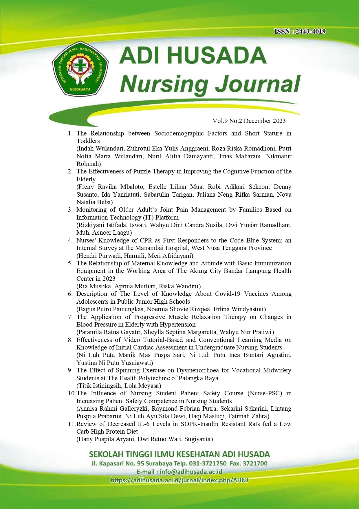 Iswati, I. (2015). Pengetahuan Dan Penerapan Sasaran Keselamatan Pasien Pada Mahasiswa Semester 6 Di Akademi Keperawatan Adi Husada Surabaya. Adi Husada Nursing Journal, 1(1), 6. https://doi.org/10.37036/ahnj.v1i1.3