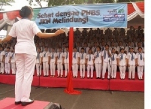 Ir. Tri Rismaharini, MT., Walikota Surabaya, bertindak selaku inspektur upacara menyampaikan sambutan Menteri Kesehatan RI. Momen peringatan Hari Kesehatan Nasional ke-49 ini dimaknai sebagai tonggak dimulainya Jaminan Kesehatan Nasional menuju masyarakat Indonesia sehat.