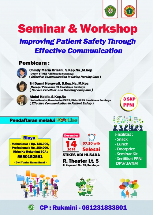 Berdasarkan hal itu maka STIKES Adi Husada mengangkat tema Seminar dan Workshop tentang “Improving Patient Safety Through Effective Communication”. Kegiatan ini disampaikan dengan pembicara di bidangnya antara lain :