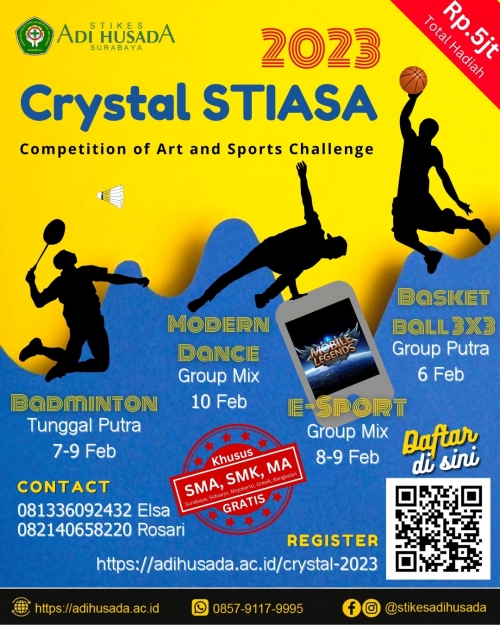 Dalam rangka Meningkatkan prestasi dan memupuk sportivitas dalam bidang non-akademik, khususnya olahraga dan seni serta meningkatkan rasa persatuan dan persahabatan di antara siswa-siswi, maka kami akan mengadakan kegiatan CRYSTAL STIASA “Competition of Art & Sports Challenge” 2023 sebagai berikut: